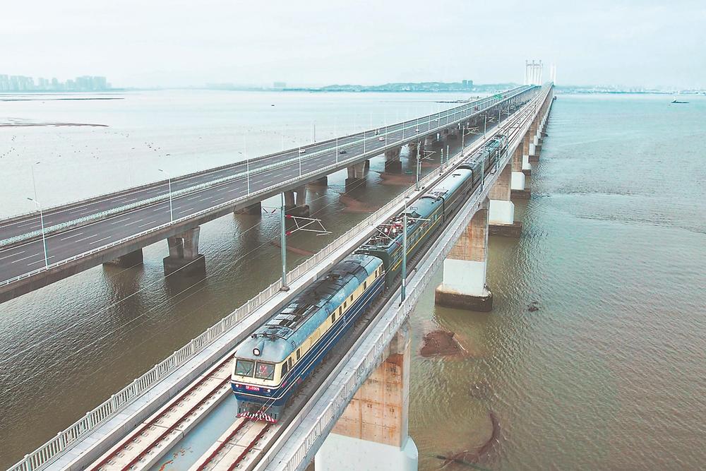 福厦高铁全长277.42公里,正线桥梁84座、隧道29座,桥隧比高达85.1%,是我国“八纵八横”高速铁路网中东南沿海高铁大通道的重要组成部分。福厦高铁预计在今年9月底具备开通运营条件。图为检测列车通过泉州湾跨海大桥。
