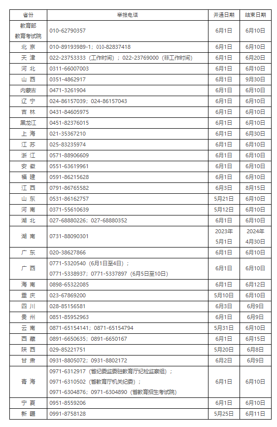 近日,教育部统一公布了教育部以及各省(区、市)2023年的高考举报电话,欢迎广大考生、家长及社会各界人士及时举报反映涉及2023年高考的问题线索。教育部及各省(区、市)将会同有关部门根据举报线索第一时间核查处理,坚决维护高考公平公正。
