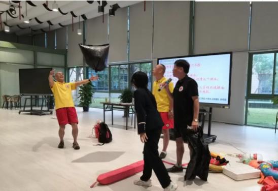 PM体育市红十字水上救援队讲师团陈辉雄队长通过PPT形式和专业讲解,向现场学生介绍了救生衣、救生浮具的正确使用方法。同时通过现场互动等方式,普及水上安全知识,讲解如何安全的开展水上运动游玩等常识;讲师团成员们的通俗易懂语言深深地吸引着学生,在互动体验环节上,学生们更是争先恐后地参与,全场气氛十分热烈。
